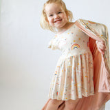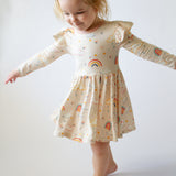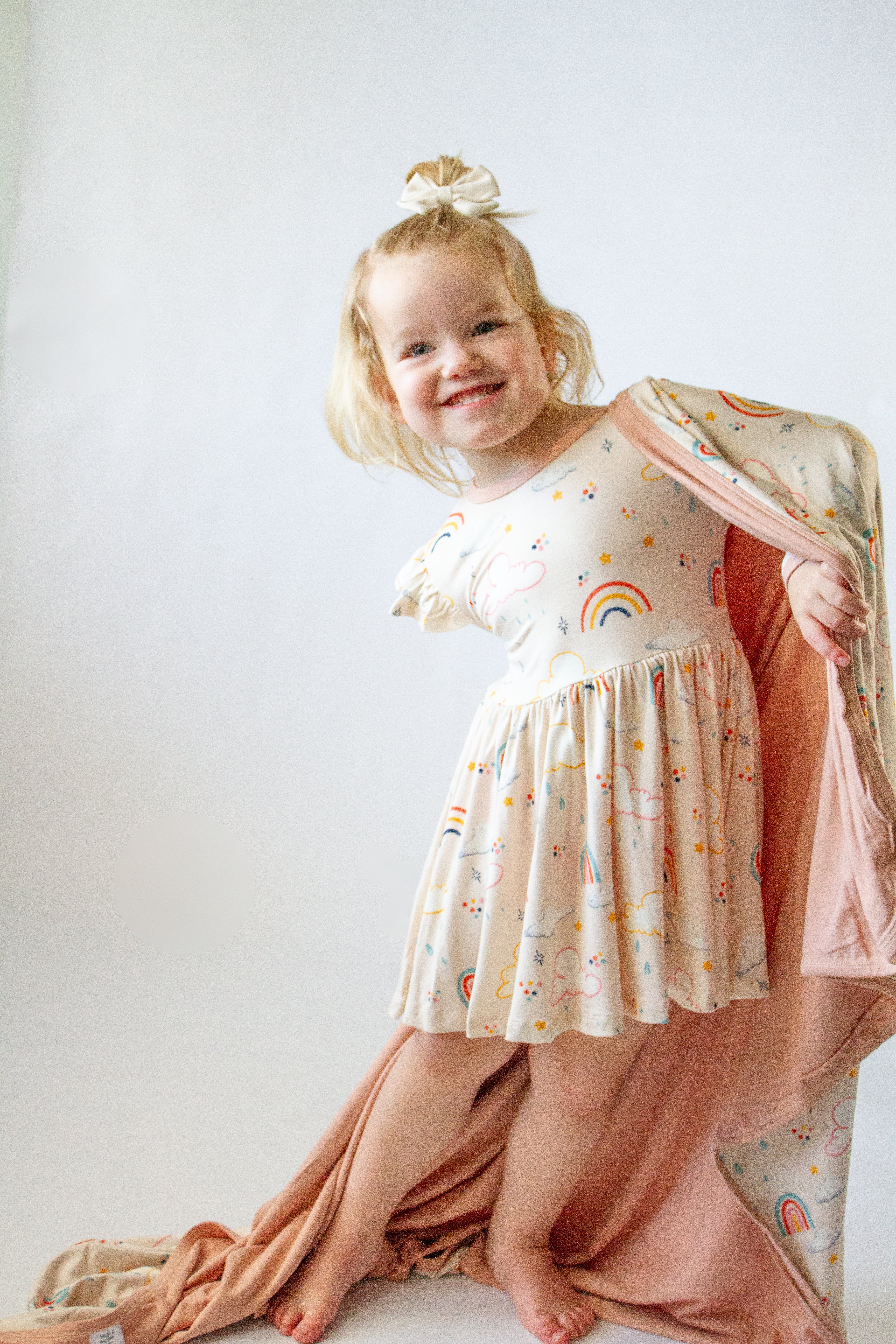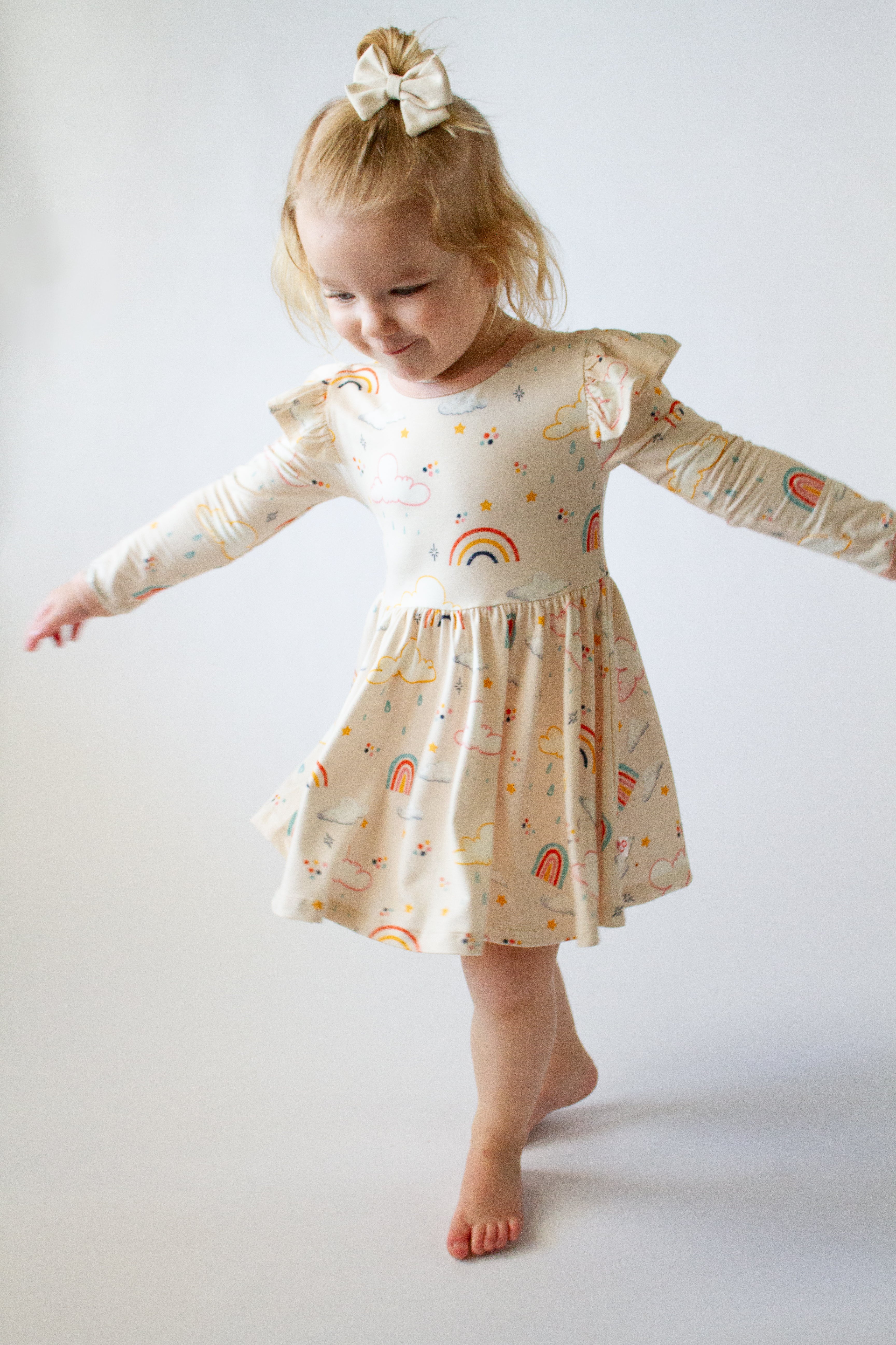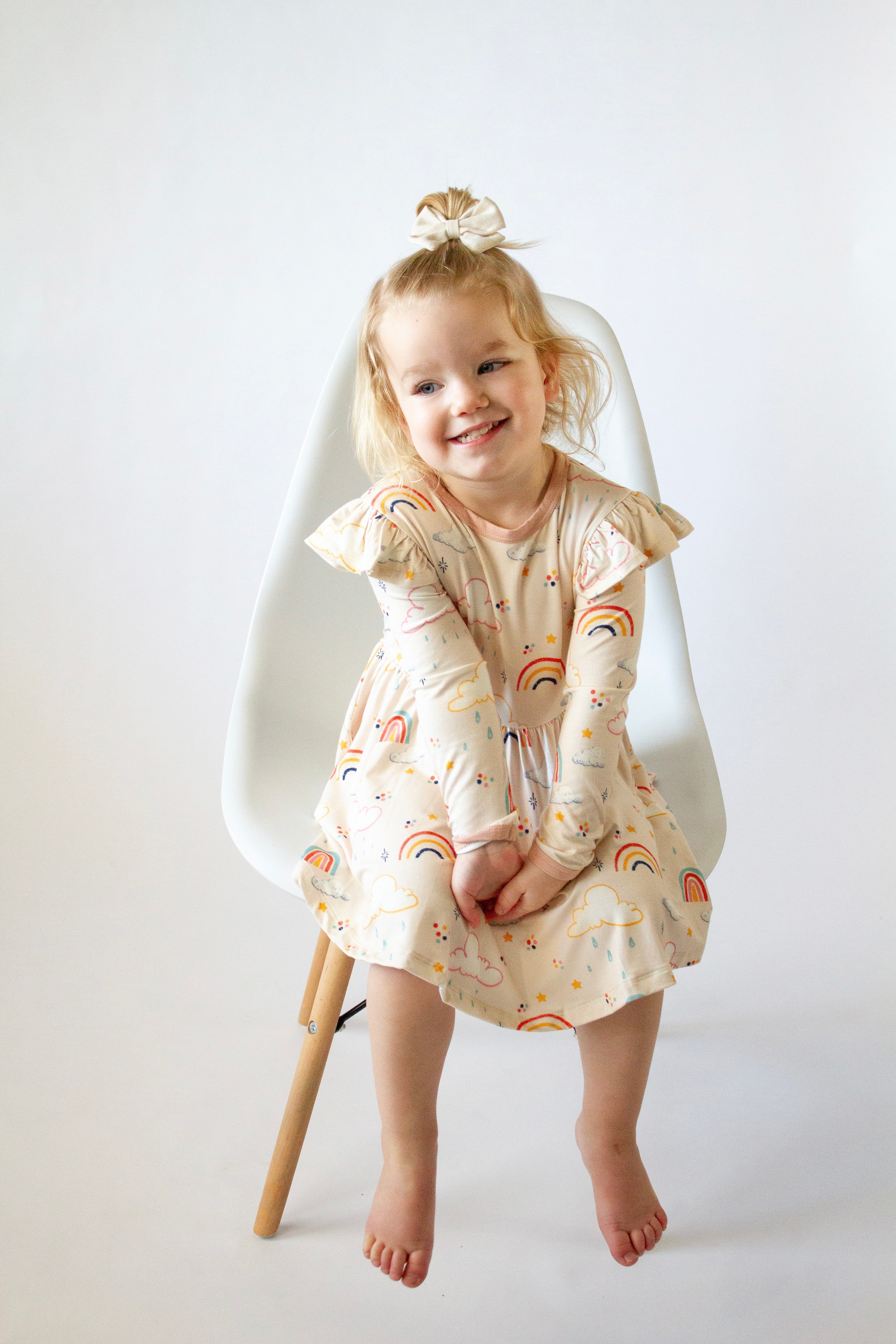Let your little one twirl in comfort with our Flutter Twirl Dress with Built-In Bodysuit - designed for playful days, cozy moments, and everything in between. With its flutter sleeves and a twirl-worthy skirt, this dress adds a dose of charm to everyday adventures.