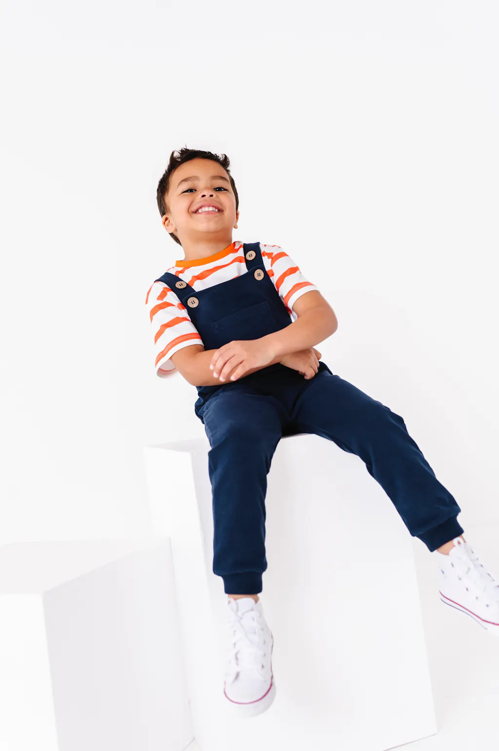 Great quality and comfy fit. The overalls + striped t-shirt combo is so cute.