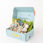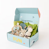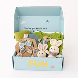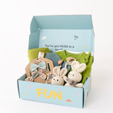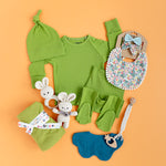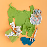 Choose from a selection of warm, timeless color palettes. The swaddle blanket, romper, and hat will match the variant you select, while each box is thoughtfully paired with a complementary bib and cuddle buddy to complete the perfect gift experience.