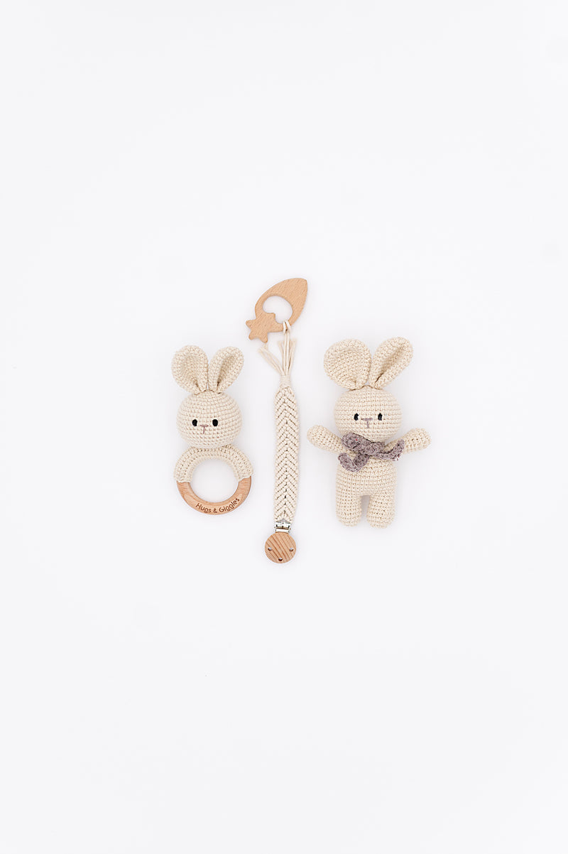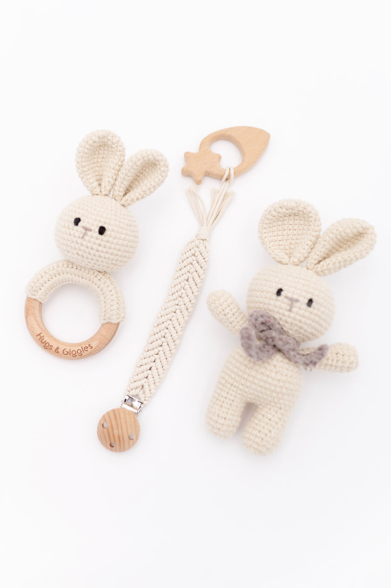 Handmade with love and full of charm, our Baby Snuggle Gift Set is the perfect little trio for your baby’s earliest moments of comfort and discovery. Thoughtfully created for tiny hands and growing curiosity, each set includes: