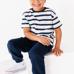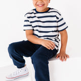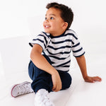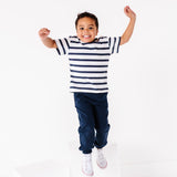 Designed with a classic striped pattern and relaxed fit, it blends timeless style with everyday durability. Ideal for school, playdates, or lounging at home, this organic cotton t-shirt for kids is gentle on sensitive skin and made to last wash after wash.